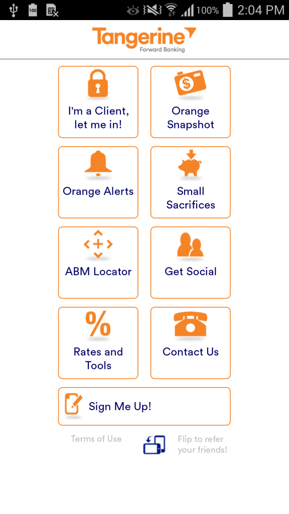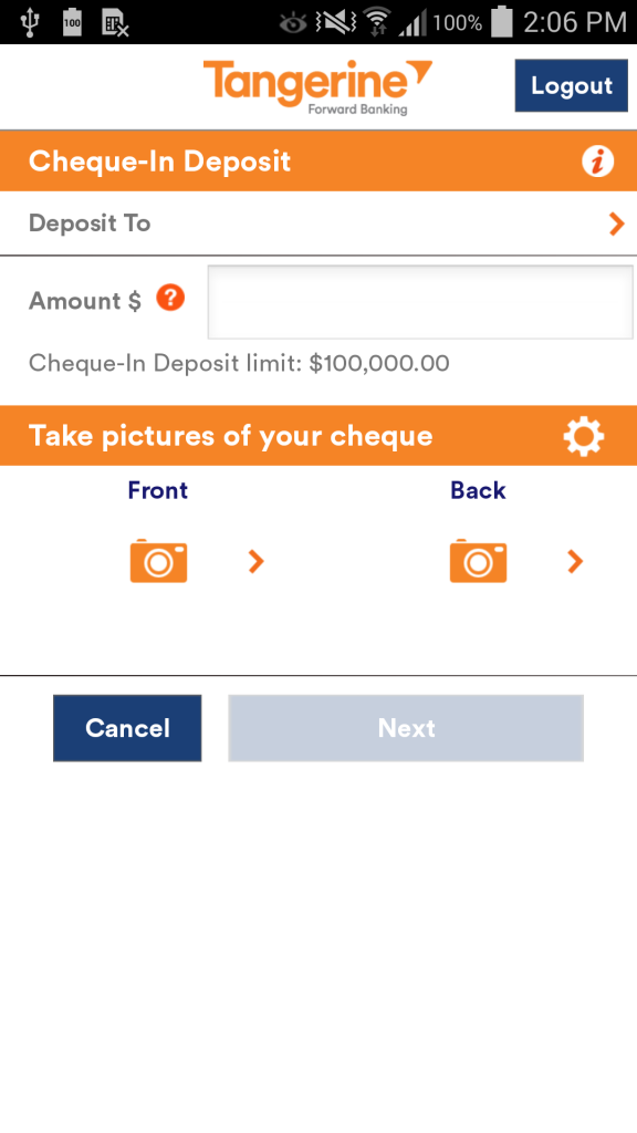 You can check your account balances, review transactions, transfer funds, email money, locate ABMs, get info for the Tangerine Cafés and even deposit a cheque with Cheque-In.